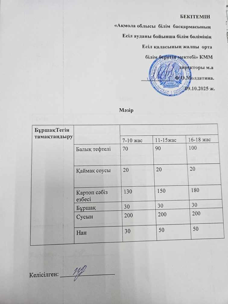 Ас-мәзірі 09.10.2025 ж